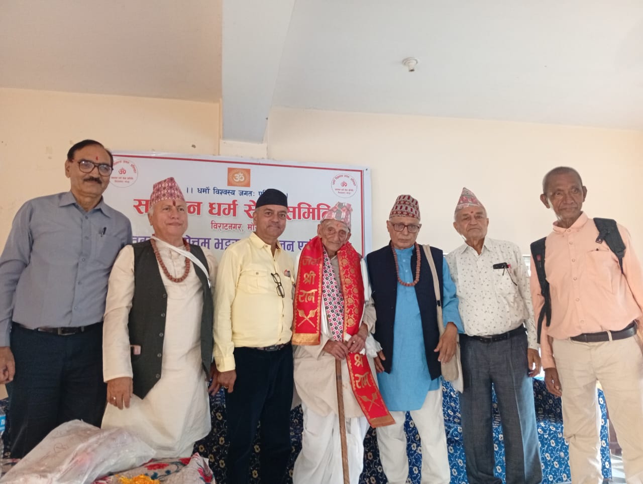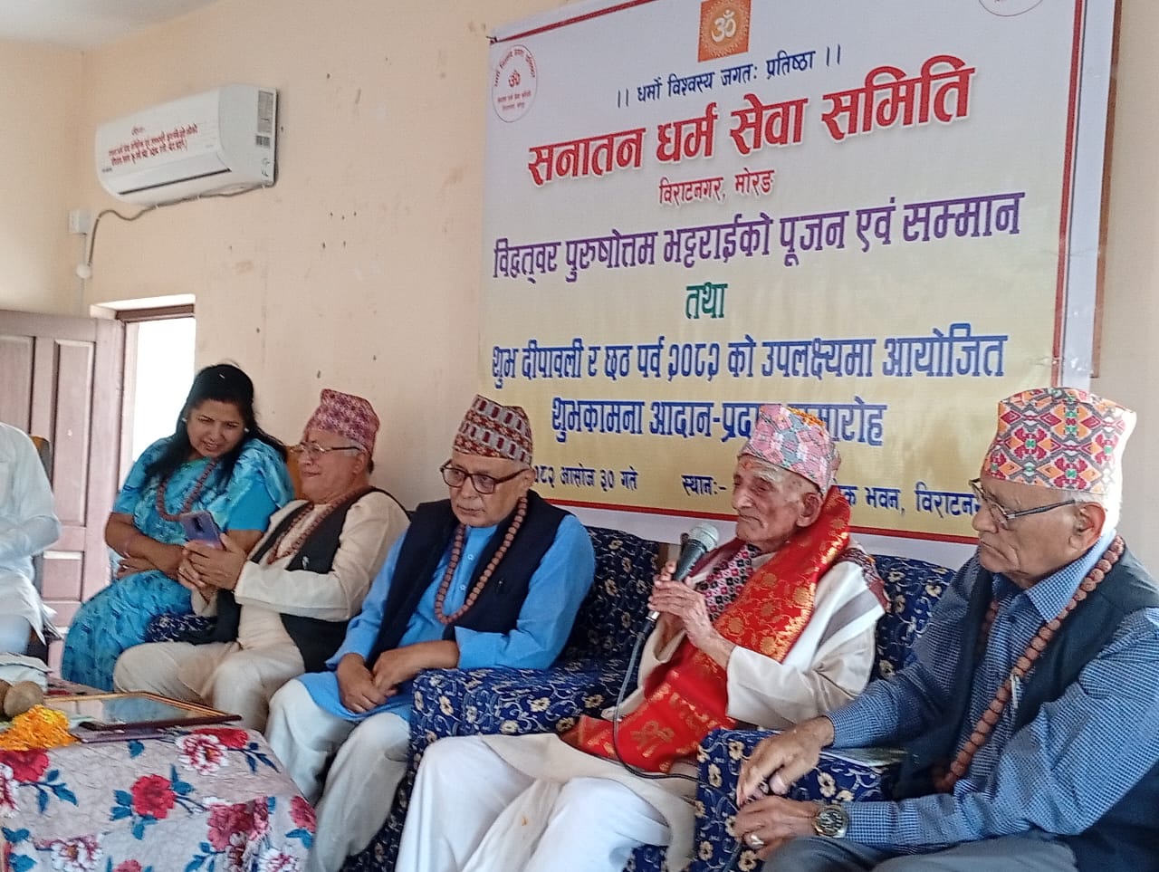 सनातन धर्म सेवा समिति मोरङ द्वारा आज असोज ३० गते विराटनगरमा आयोजित एक समारोहका बीच विद्वत व्यक्तित्व श्री पुरुषोत्तम भट्टराई( सुनसरी धरान)लाई “सनातन धर्म संस्कृति सम्मान २०८२”अर्पण गरियो ।